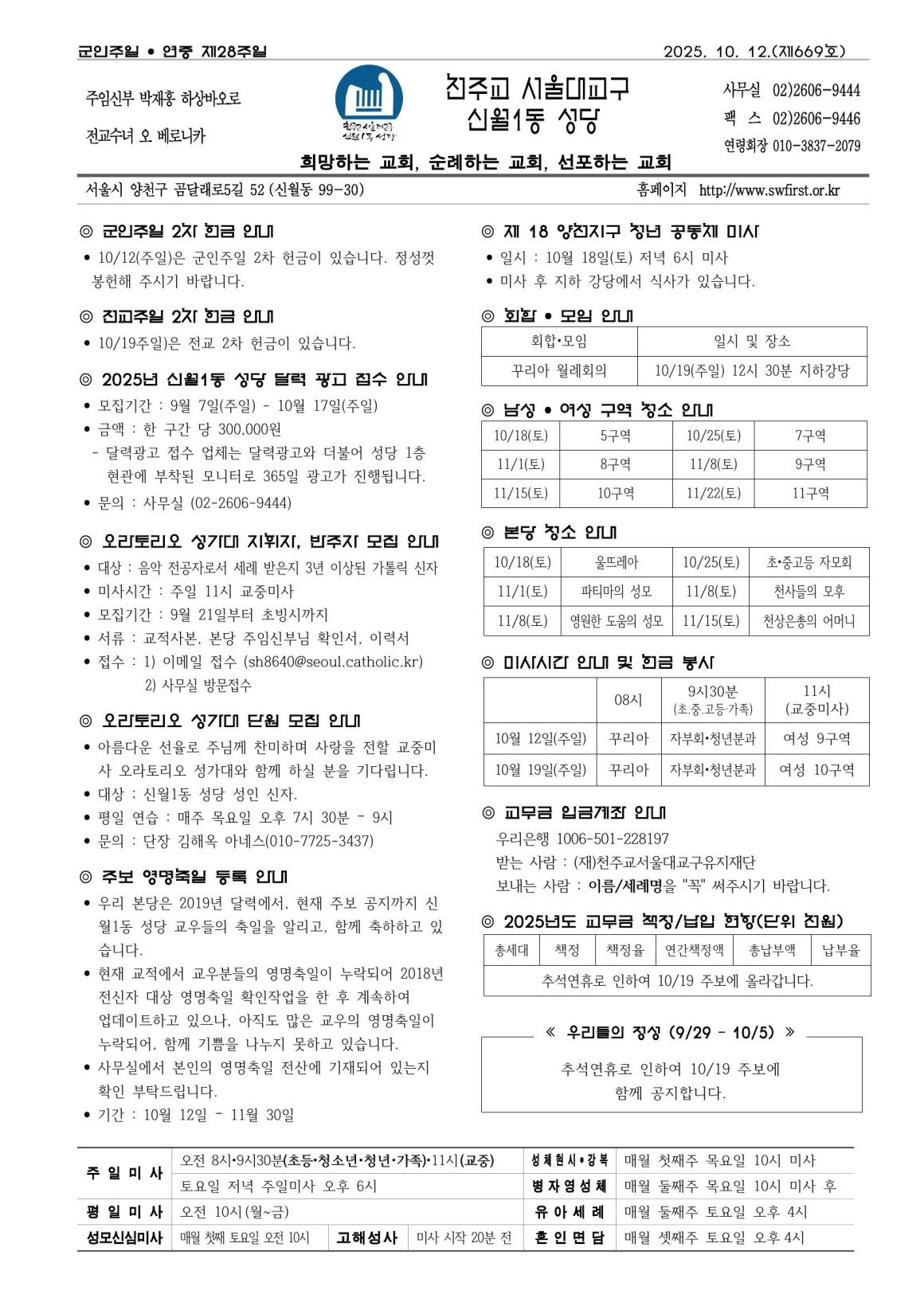 10월 12일 연중 제28주일•군인주일 페이지 정보 작성자 기획•홍보분과 댓글 0건 조회 144회 작성일 25-10-10 08:49 목록 본문 댓글 0 댓글목록 등록된 댓글이 없습니다.